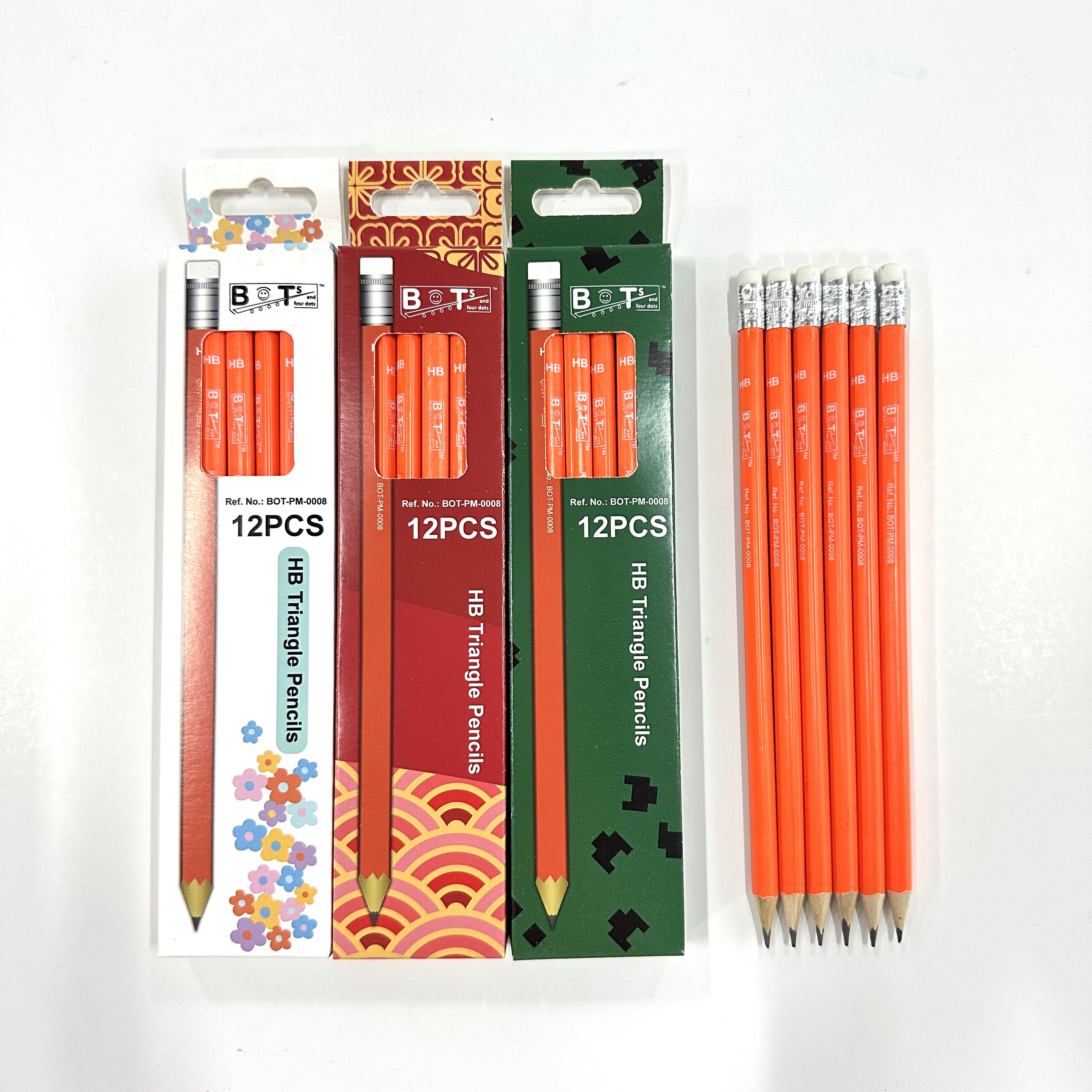 BOTs and four DOTs, HB Triangle Wood Lead Pencils, Sharpened with Eraser, (12 Pencils in Box, 6 Boxes in Pack), Ref. No.: BOT-PM- 0008., Color Yellow, Material Wood, Point Type Fine, Pencil Lead Degree (Hardness) HB.